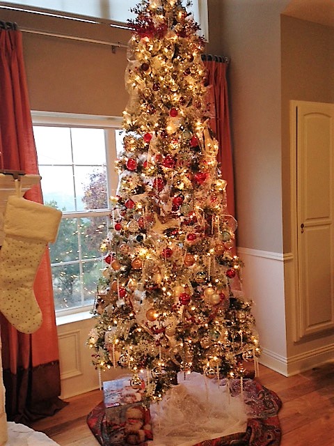 The kitchen island, visible from the living area, has a large mirrored tray on it filled with snow globes and live flowering plants. I've covered the hand oiled red cedar top with a clear vinyl cover in preparation for the 13 children who will be here for Christmas Eve brunch! (All my sister's grandchildren. My two will not be here this year.)